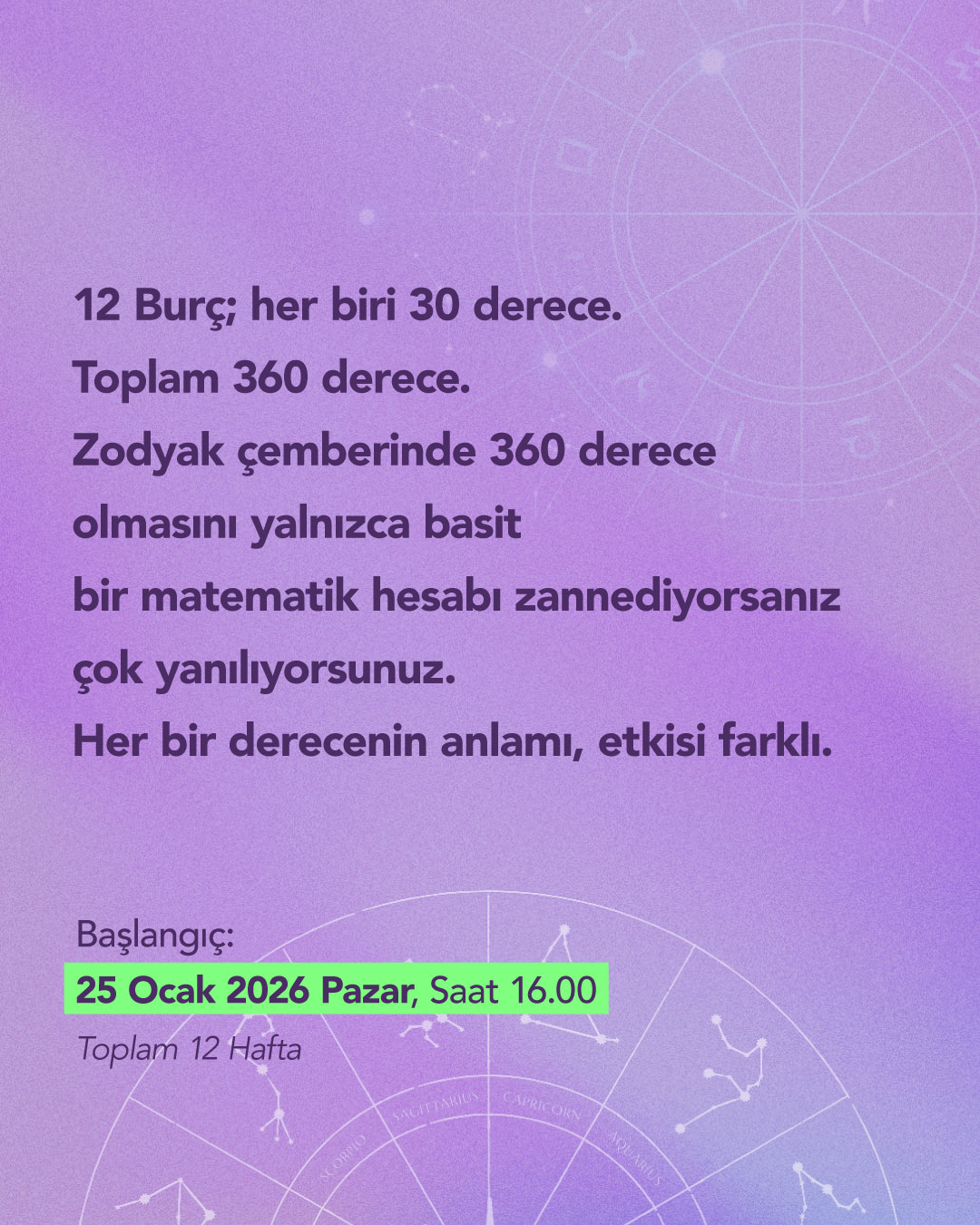 12 Burç; her biri 30 derece.