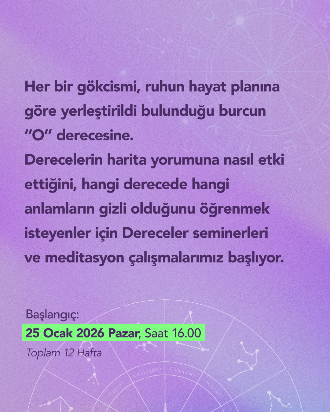 Derecelerin harita yorumuna nasıl etki ettiğini, hangi derecede hangi anlamların gizli olduğunu öğrenmek isteyenler için Dereceler seminerleri ve meditasyon çalışmalarımız başlıyor.